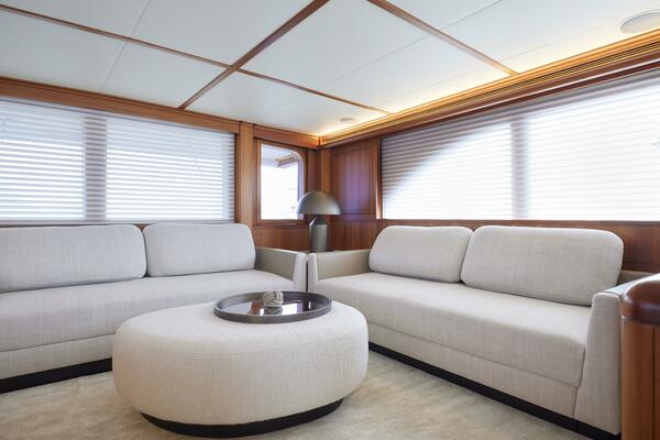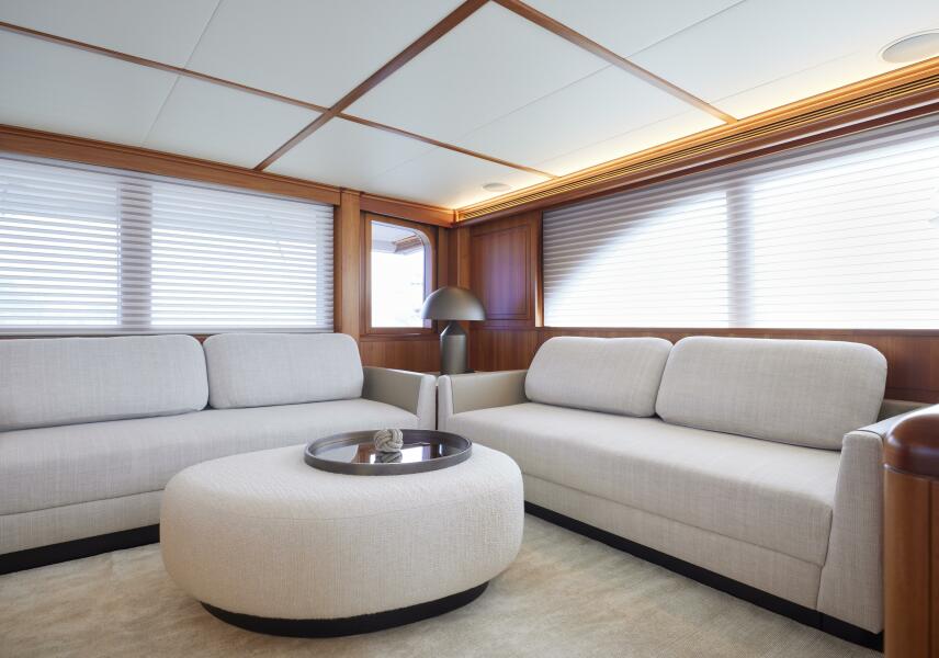 As you enter the salon from the mezzanine seating on the starboard quarter, you are immediately struck by the 360 degrees of windows, allowing natural light and great vistas, all of which can be hidden by the push of a button, as the custom electric blinds quietly obscure the outside world. The blend of classic teak wood joinery combined with rich fabric creates an atmosphere of classic luxury and comfort. All loose furnishings have been replaced throughout the vessel.