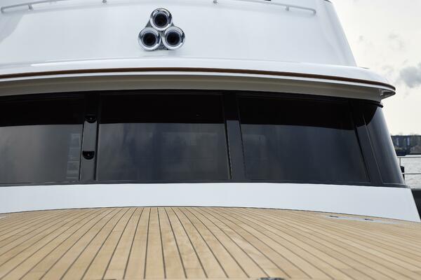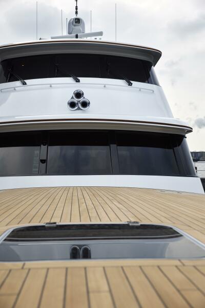 Aft of the enclosed pilothouse, through centerline, double teak French doors is the upper outdoor seating. Equipped with two comfortable teak love seats to port and starboard, providing another extraordinary place to relax and take in the sights. This deck also has two hidden wing stations for easy docking and maneuvering in tight situations or positioning the yacht when a fish is on the line.