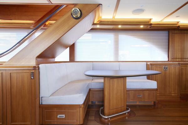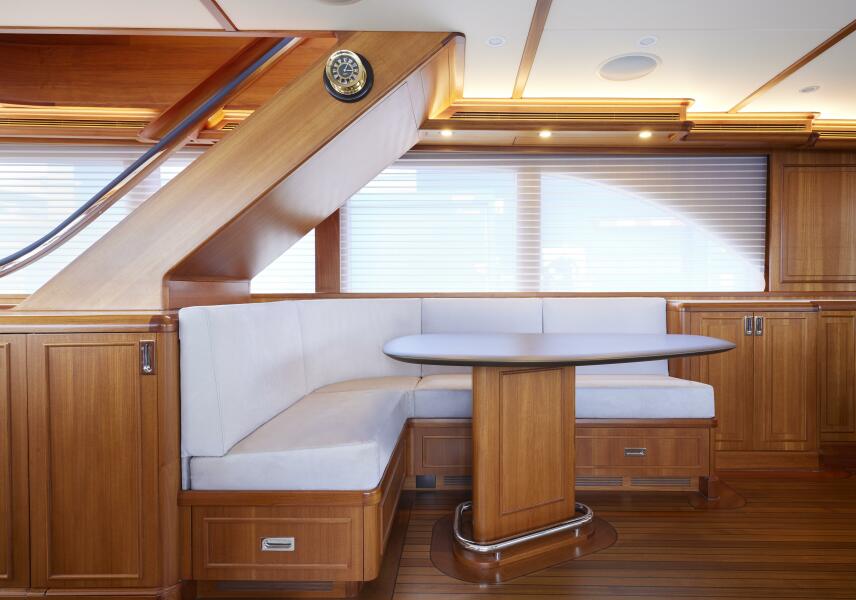 • Teak corner benches with tables, aft of the wheelhouse