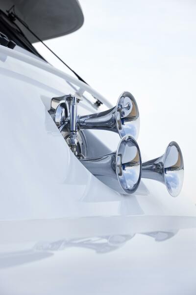 The engine room, accessed centerline from the cockpit, is beautifully detailed in keeping with the rest of the yacht, down to the high-polish diamond plate flooring with a spare set of powder-coated plates for when maintenance is carried out.