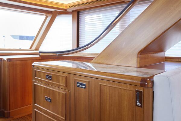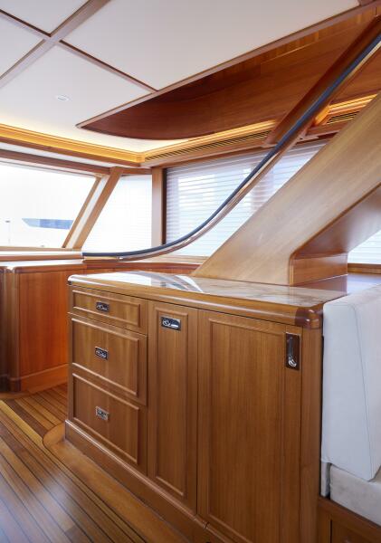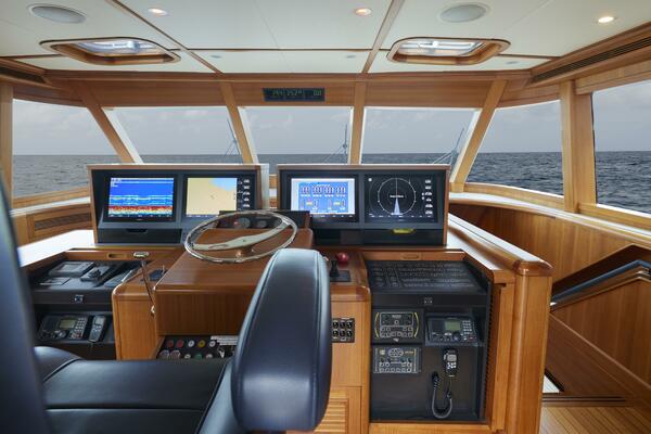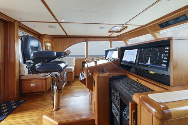 The pilothouse was completely redesigned in the major refit. This oversized bridge has an extremely elaborate “glass-bridge” electronics package that is enclosed in custom teak dropdown boxes. One Stidd helm chair, (2) L seats to port and starboard, and a large couch in front of the helm area, allowing seating for more than (8) guests in the bridge. A great place to enjoy the 360° views while underway.