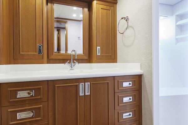 Leading forward down the centerline stairway from the galley to port is the VIP Stateroom. This stateroom comfortably sleeps 3 with two twin berths, which can convert to a double berth, plus a Pullman berth that folds into the bulkhead. Access to the private en-suite head is also available in this cabin.