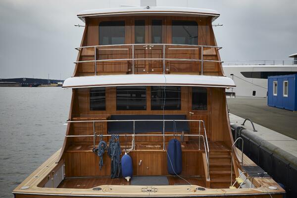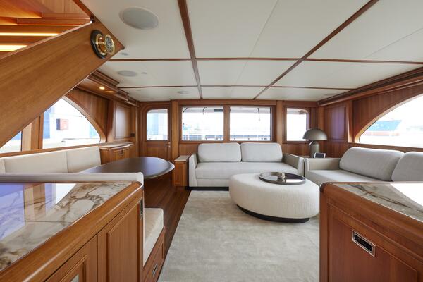 • Custom-built teak bulkhead with teak double French doors leading to the outdoor seating area aft