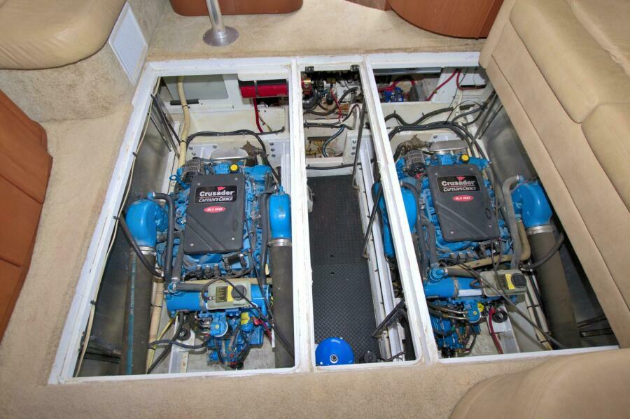 Powered by dependable 8.1 Crusader engines with under 370hrs and equipped with a 10kw Kohler generator, this motoryacht ensures a smooth, reliable performance on the water. Additional features like a bow thruster, Raymarine Axiom touchscreen chart/radar, tri-zone air conditioning, central vacuum system, and more, enhance your cruising experience. This vessel truly offers the best in marine living.
