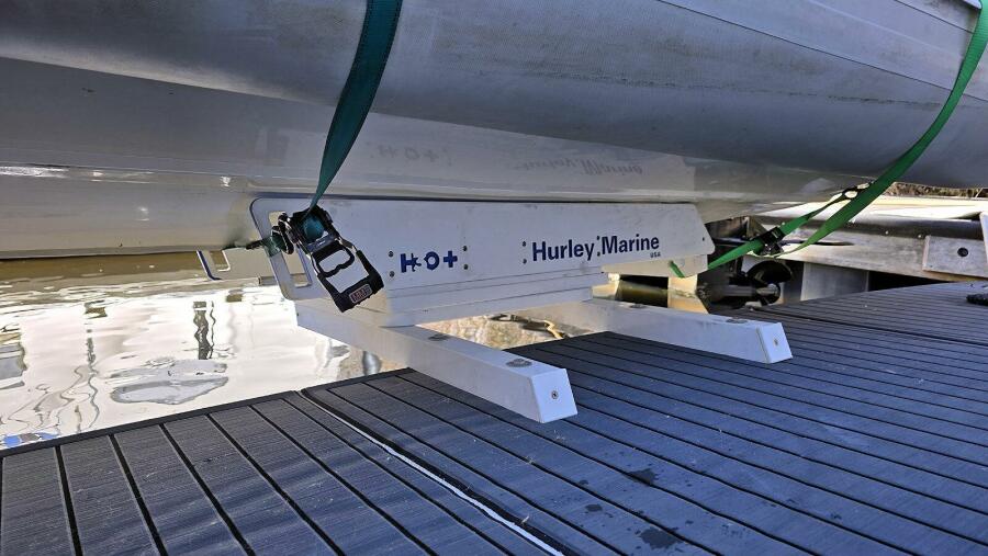 The swim platform continues the thoughtful design with SeaDek flooring for secure footing and easy maintenance. A large transom storage locker provides convenient space for lines and water toys, while the Hurley H3O davit system supports the included Gala RIB tender with outboard. An insert in the swim platform supports a Magma propane grill and a retractable shore power cord system keeps the platform organized and clutter-free, making boarding, water access, and tender operations both efficient and enjoyable.