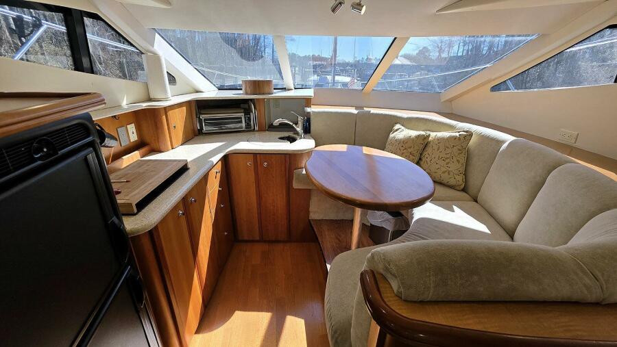 The raised galley and dinette are designed for both practicality and panoramic comfort, positioned up where the large surrounding windows provide abundant natural light and excellent visibility. The galley features durable Corian style countertops, a large stainless-steel sink basin, a Princess two-burner electric cooktop, a Faberware microwave oven, and the added convenience of a Ninja air fryer. Refrigeration is handled by an AC/DC Norcold unit with a separate freezer compartment, supporting extended cruising needs. Opposite the galley, a comfortable three- to four-place dinette with a hardwood tabletop offers an inviting dining space that also serves as a workspace or gathering area. Laminate plank flooring ties the space together with a clean, modern look that is both attractive and easy to maintain.