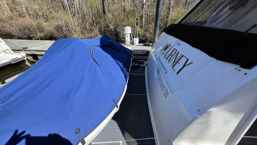 Board Our Journey easily via the generous swim platform and step through the transom gate into the cockpit. The cockpit is perfectly proportioned for line handling, boarding guests, or setting up deck chairs at sunset. Molded steps lead you safely to the flybridge, and wide access forward makes moving around the boat simple and secure.