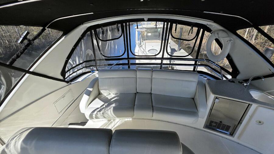 The flybridge is both a commanding helm station and an expansive entertainment space. At the helm, recent upgrades include a new Garmin multifunction display, new radar, new AIS, bow thruster control, backup camera display, and a large Samsung tablet dedicated to navigation, delivering modern situational awareness and confident maneuverability. Guest seating is generous, with a two-place bench seat at the helm, a large bench seat directly aft, and a comfortable portside lounging bench, making this an ideal gathering space underway or at anchor. A well-appointed wet bar with Corian-style countertops, ice maker, and in-counter sink basin enhances onboard entertaining, while a substantial aft storage area provides practical space for cruising gear. The full enclosure with Isinglass panels extends the usable season and adds protection from the elements, and convenient access to both port and starboard side walkways ensures safe movement forward to the bow.