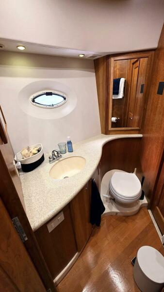 The midship guest stateroom offers a comfortable double berth with true standing headroom, making it far more inviting than a typical crawl-in cabin. Thoughtfully designed with excellent storage, it provides guests with privacy and practicality, whether hosting family for a weekend or another couple for an extended cruising segment.