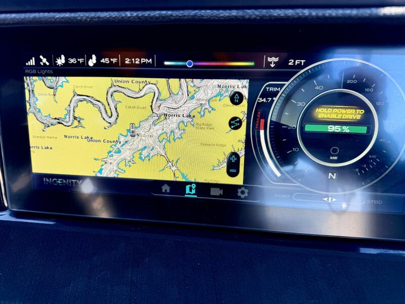 This One-Owner 2023 Correct Craft Ingenity 100% Electric Powered Aluminum Boat For Sale near Norris Lake Tennessee is equipped with a Cascadia Motion 580Nm Electric Motor producing around 195-225HP (Manufacturer Rates it at 295HP) that's paired with a 400V/126kWh Liquid-Cooled Li-Ion Battery Pack and a Bravo III Dual Prop Outdrive and features an aluminum hull, an onboard 11kW L2 Charger for charging the Motor Batteries, a Heat Pump Thermal Management System, plus an Onboard ProMariner Charger for the House 12V Battery with Battery Switch, a 300W/120V Inverter with 2 Outlets, a fixed Arch with Bimini Top that a Bow SunShade can be attached to for additional shade, other canvas includes a Cockpit, Bow & Mooring Covers (plus a Transport Cover for winter storage). The feature list continues at the Driver's Helm with an Electric Powered Telescoping Driver Seat with a Flip-Up Bolster and manual Slide & Swivel adjustments, a Gussi Italia Tilt Steering Wheel with Dometic Optimus Electronic Powered Steering & Electric Actuator to create incredibly smooth steering controls with a 12'' IngenityView Touchscreen equipped with an integrated GPS/Chartplotter, Depth, Air, & Water Temperature Displays, Speed/Power Consumption with Estimated Range, Charging Status, Drive Trim, Rudder Angle Indicators, an Awareness Camera/Rear View Camera, RGB Lighting Color Selector & More, plus a wireless phone holder/charger is provided at the helm. Other highlights throughout the cockpit include an Isotherm Stainless Steel 12Volt Refrigerator, plus a Removable 36Qt Igloo Cooler with Dedicated Under-Seat Storage, an upgraded JL Audio Stereo with 4 Stereo Remotes and 2 Subwoofers, 12 Volt charging for up to 14 devices, Convertible Bow Seating, Aft back to back seats that convert to sun loungers, RGB Color Changing Interior, Backlit speakers, and Under Water Lights, LED Docking Lights, in-floor storage compartment, Fire Supression System, SeaDek Flooring Throughout, (4)Phender Pro Fender Clips/Mounts, (6)Pull-Up Cleats, a 2022 BoatMate Tandem axle trailer with aluminum wheels, dual disc brakes, a swing tongue, drive on guides, and a step up ladder is included! Transferable warranty through 2027 and much more!