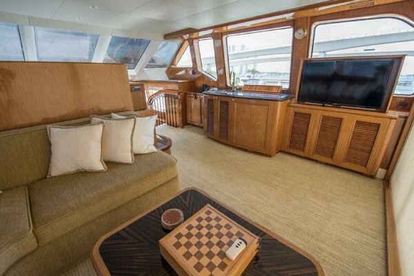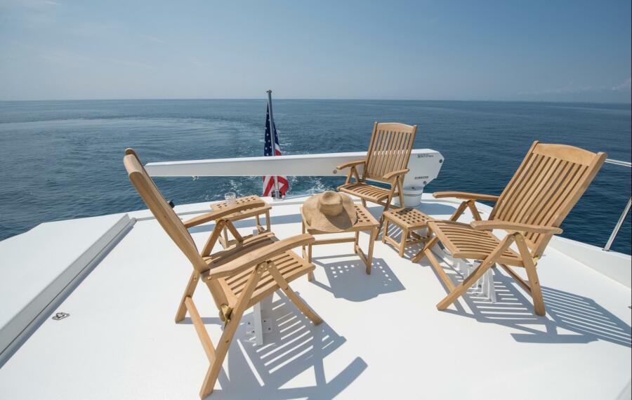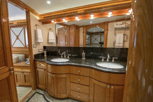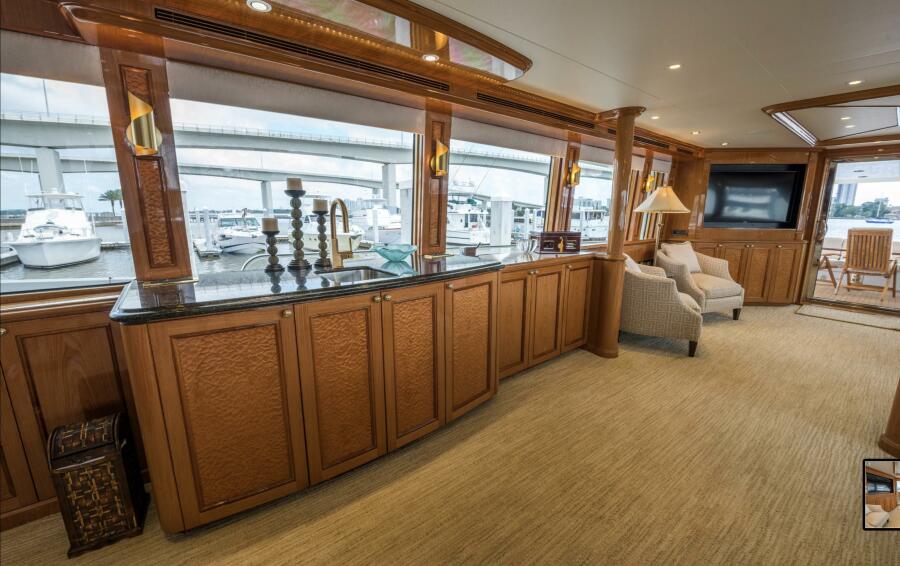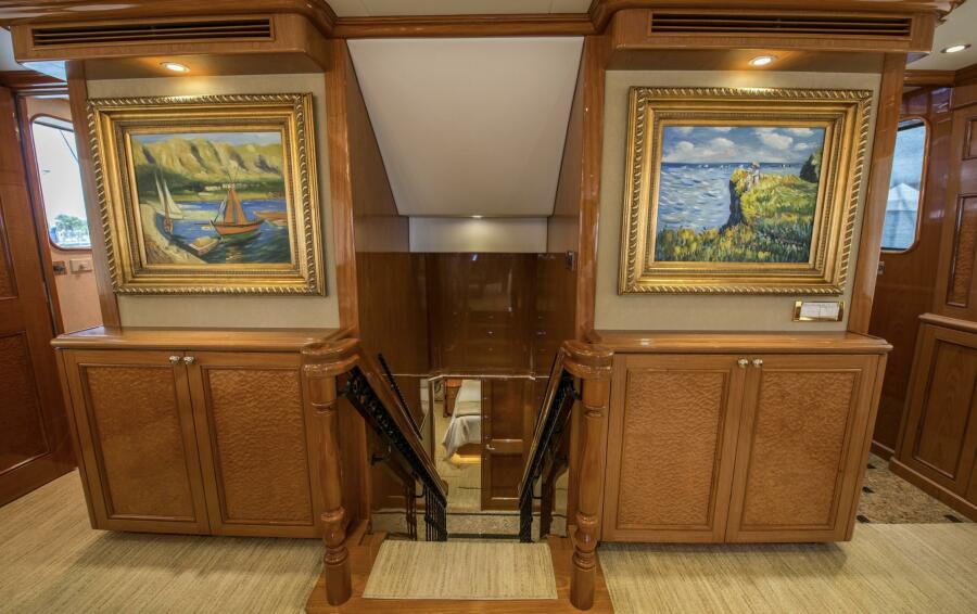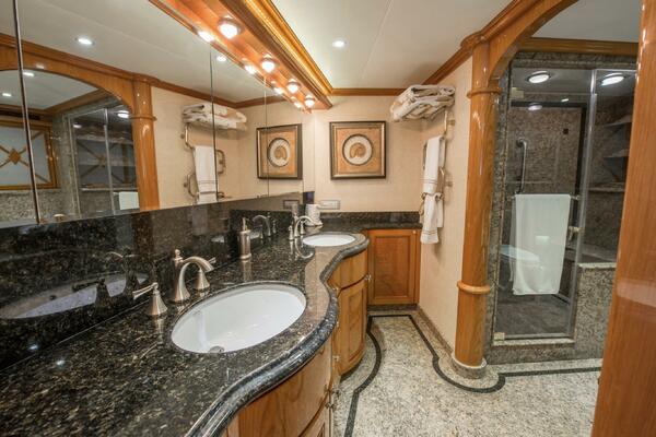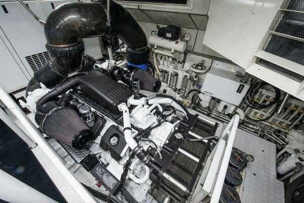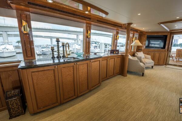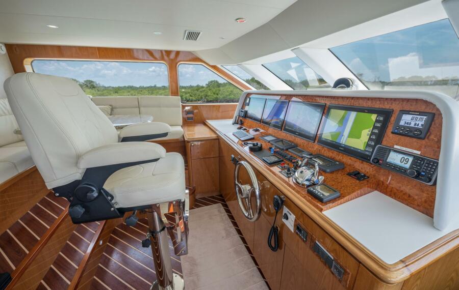 Twin Caterpillar C32 diesels (1,652 HP each, total 3,304 HP) power FOOTLOOSE to a thrilling 26-knot top speed and efficient 18-knot cruise. Her 5,300-gallon fuel tanks yield a 1,267-nm range, ideal for transoceanic runs or island-hopping. Quantum zero-speed stabilizers ensure silky rides and reliability. Upgraded Garmin electronics suite includes Four Garmin 8617's, radar, autopilot, and AIS for effortless command from the raised pilothouse or flybridge helm.