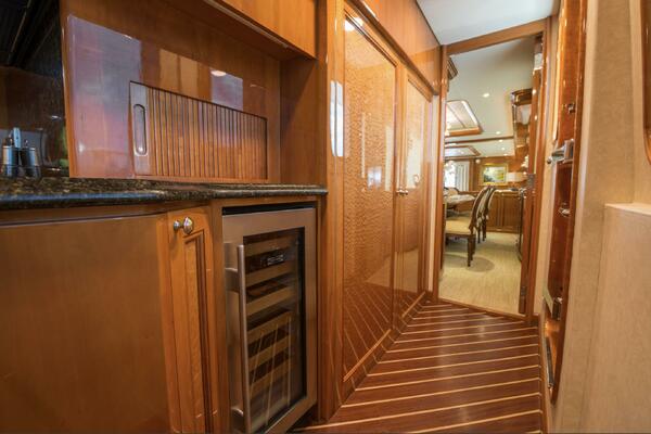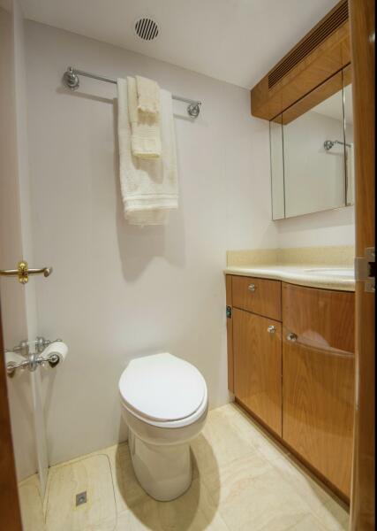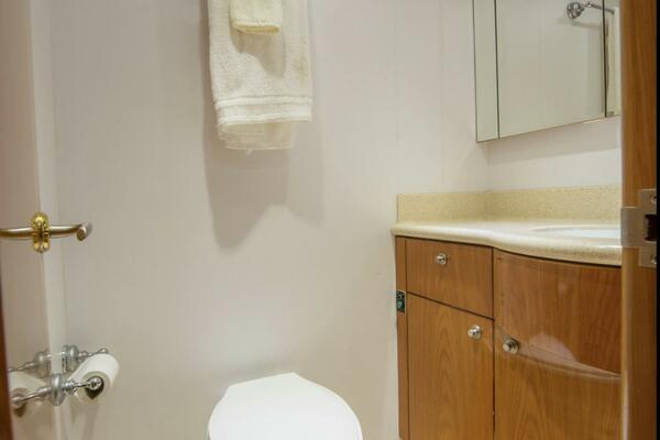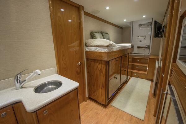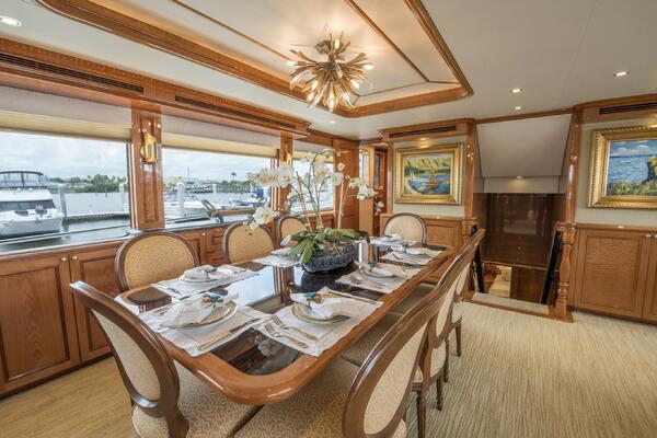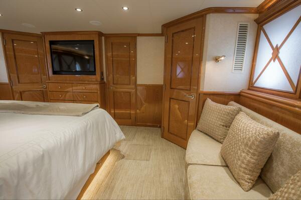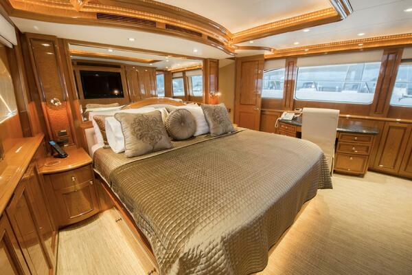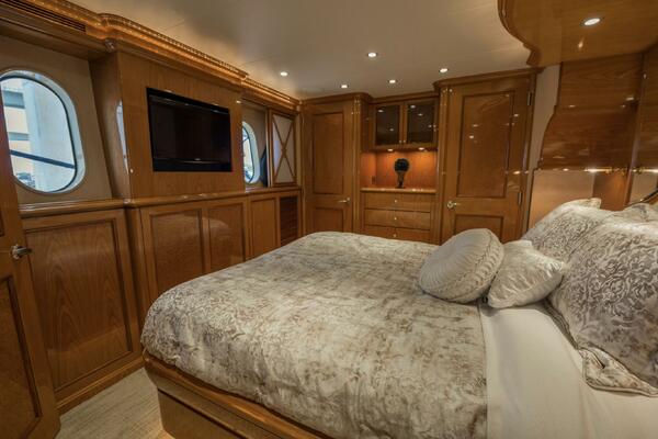FOOTLOOSE sleeps 8 in four lavish en-suite staterooms: a full-beam main-deck master with king berth, walk-in closets, and spa bath; a forward VIP with another king; and two amidships queens. Warm teak interiors, neutral palettes, and refreshed soft goods create serene spaces. The salon-dining flows to a pro galley and wetted bar. Crew of 3-4 quarters separately with full amenities.